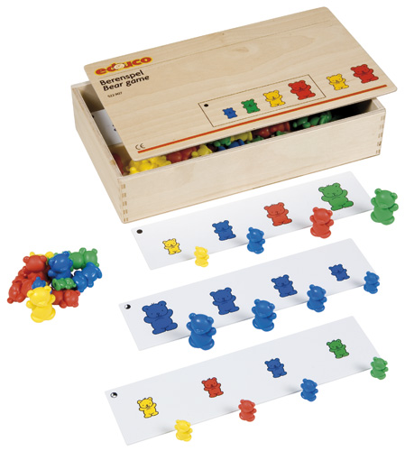 Met het Beersorteerspel leren kinderen om te sorteren op kleur, vorm en grootte. Dit spel valt onder het domein rekenen – meetkunde – sorteren en seriëren. Het doel van het spel is om kinderen op kleur, vorm en grootte te leren sorteren. De stippen op de opdrachtkaart geven de moeilijkheidsgraad aan. Bij het spel zit ook een pincet om de beren op de juiste plek te plaatsen. Hierdoor wordt niet alleen gewerkt aan de rekenvaardigheden, maar ook aan de fijne motoriek. Leeftijd: vanaf 4 jaar