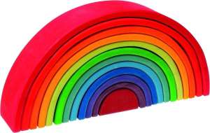 Dé klassieker van Grimm’s: De regenboog! Deze kleurrijke houten regenboog van Grimm’s is al voor de allerkleinsten leuk om mee te stapelen, bouwen, en sorteren. En is het kind wat ouder dan worden deze houten bogen ineens een flat, zeemeermin, treintunnel, een flat, een stalletje, enz. Je ontdekt keer op keer nieuwe vormen, figuren of spellen. Naast het plezier van bouwen en spelen ontwikkelt het kind ook de fijne motoriek en het ruimtelijk denken. De gebruikte materialen zijn 100% veilig voor baby’s vanaf de geboorte.