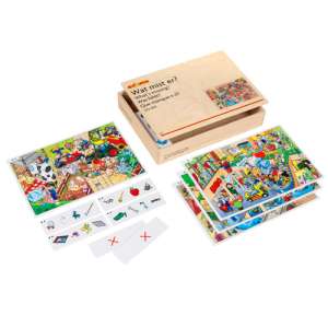 Eén object mist; kun jij het vinden? Kies een gedetailleerde themaplaat en de bijbehorende opdrachtstroken. De opdracht bestaat uit vier afbeeldingen. Probeer drie afbeeldingen te vinden die zowel op de themaplaat als op de opdrachtstrook voorkomen. Leer details te onderscheiden van elkaar en belangrijke eigenschappen te identificeren. Als je goed kijkt ontdek je tevens heel veel grapjes in de themaplaat.